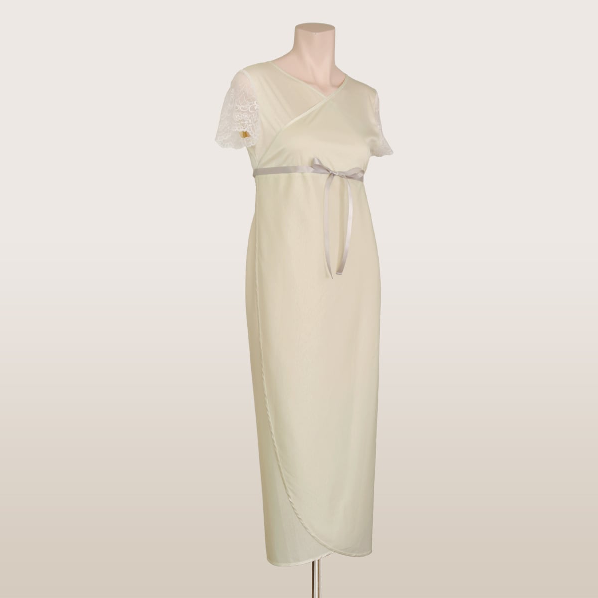 カメリアブラジャーで作り上げた胸元をしっかり包み込むため胸元のカットラインを深く重なるように、ウエストリボンをアンダーバストに引き上げました。より一層美しい胸元のラインが出来ます。斜めのカッティングで足捌きを解消しました。キャミソール部分は贅沢な一枚仕立てなので、足の擦れはありません。パイピングを一度も切らずに這わせているので、お洗濯後の型くずれが少ないです。